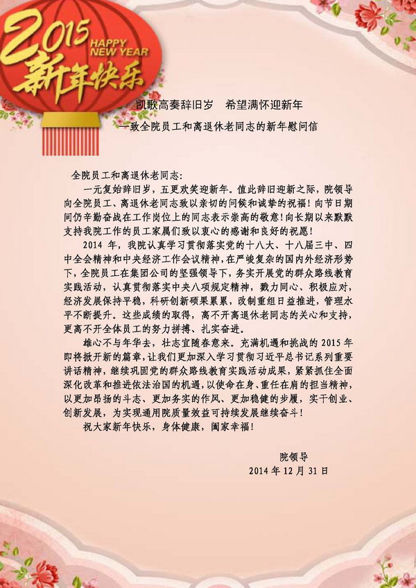 凱歌高奏辭舊歲 希望滿懷迎新年--致全院員工和離退休老同志的新年慰問信