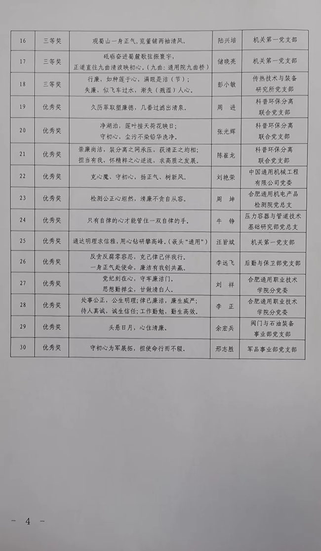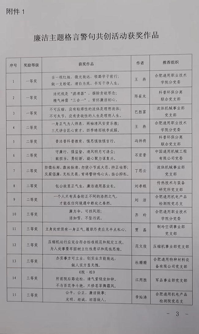 為深入貫徹落實(shí)黨的二十大和二十屆中央紀(jì)委二次全會精神,落實(shí)中共中央辦公廳《關(guān)于加強(qiáng)新時代廉潔文化建設(shè)的意見》,引導(dǎo)全院干部職工進(jìn)一步增強(qiáng)廉潔自律意識,營造干事創(chuàng)業(yè)的良好氛圍,2023年5月院紀(jì)委組織開展了以“崇廉尚潔·擔(dān)當(dāng)有我”為主題的廉潔格言警句共創(chuàng)活動。活動開展以來,各基層黨組織動員廣大干部職工積極創(chuàng)作投稿,共報送了99篇意蘊(yùn)深刻、特色鮮明的作品。經(jīng)過多輪評選,共評出一等獎作品3篇,二等獎作品6篇,三等獎作品9篇,優(yōu)秀獎作品12篇,優(yōu)秀組織獎1名。